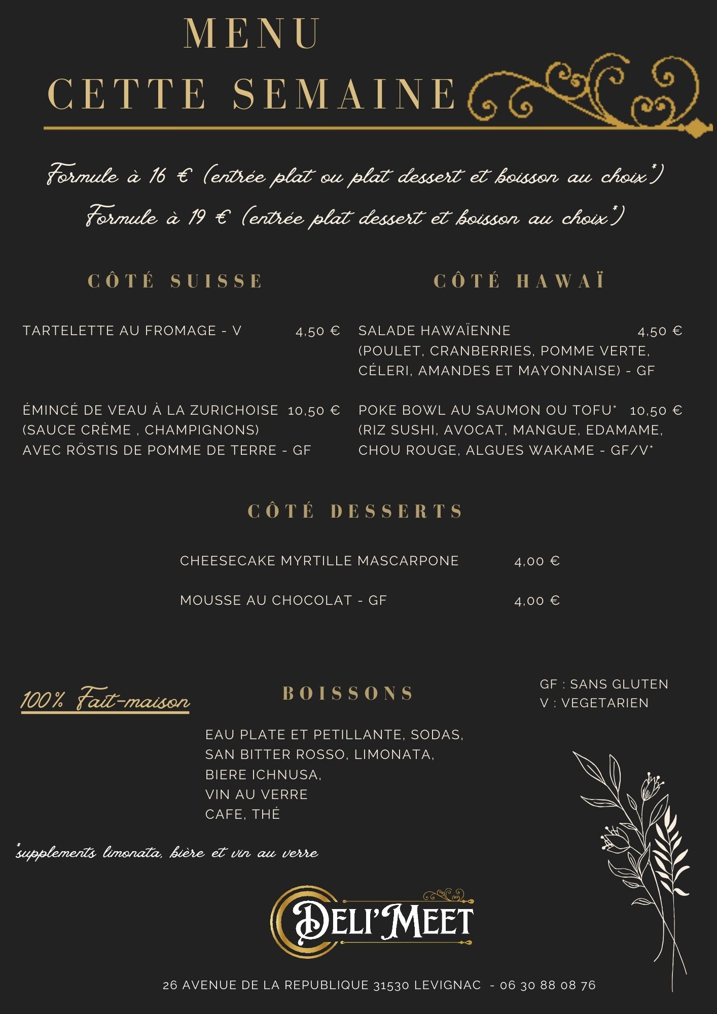 Deli’meet est une épicerie fine où vous pourrez trouver des spécialités italiennes, espagnoles et anglaises. Côté restaurant, je vous propose un menu différent chaque semaine pour vous faire découvrir des saveurs d’ailleurs et vous faire voyager . Vous pourrez déguster tout au long de la journée mes bons petits plats fraîchement préparés. Possibilité de déjeuner sur place (quelques tables et fauteuils confortables agrémentent le lieu) ou prendre à emporter sans attendre.